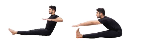 Inhale. While exhaling, bend forward and while arching the spine, draw the abdomen in, and the stretch the hands to hold the big toes with your fingers.